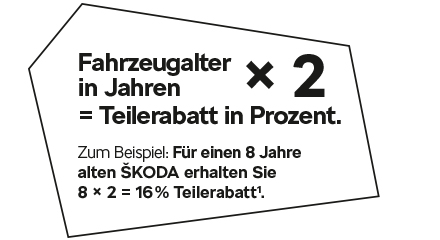 Und die rechnet sich so einfach wie überzeugend. Hier gilt: Fahrzeugalter in Jahren × 2 = Teilerabatt1 in Prozent. Das heißt zum Beispiel für Ihren 8 Jahre alten ŠKODA 16 % Rabatt auf ŠKODA Original und Economy Teile.