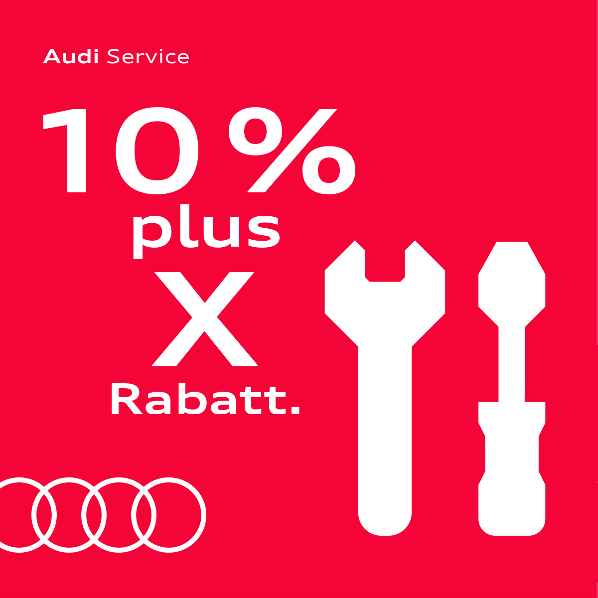 ¹ Für Audi-Fahrzeuge älter/gleich 4 Jahre ab dem Erstauslieferungsdatum welche innerhalb der letzten 12 Monate vor Auftragsannahme keinen Werkstattaufenthalt bei einem Audi Service Partner in Deutschland hatten. Der Rabatt wird gewährt auf Materialkosten. Bei der Ermittlung der zusätzlichen X Prozent werden nur volle Jahre berücksichtigt.