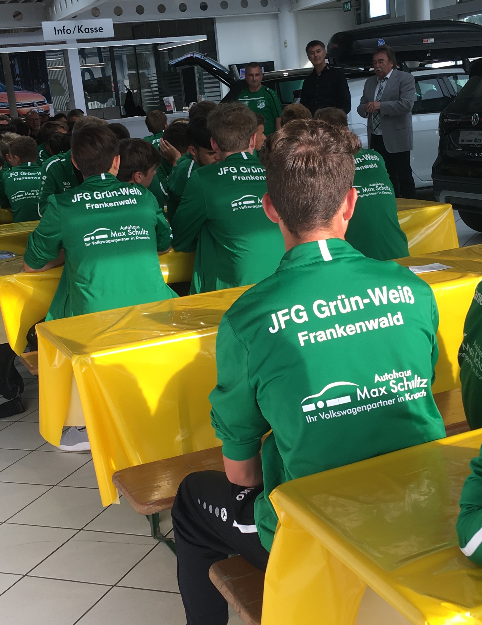 Am Freitag, den 06.09.2019. traf sich der JFG-Grün-Weiß-Frankenwald auf dem Gelände vom Autohaus Max Schultz in Kronach. Im Rahmen einer kleinen Feierstunde übergab Stefan Stumpf, Betriebsleiter des Autohauses, die neuen Trainingsanzüge an die 75 jungen Sportler und wünschte ihnen viel Erfolg für die neue Saison.